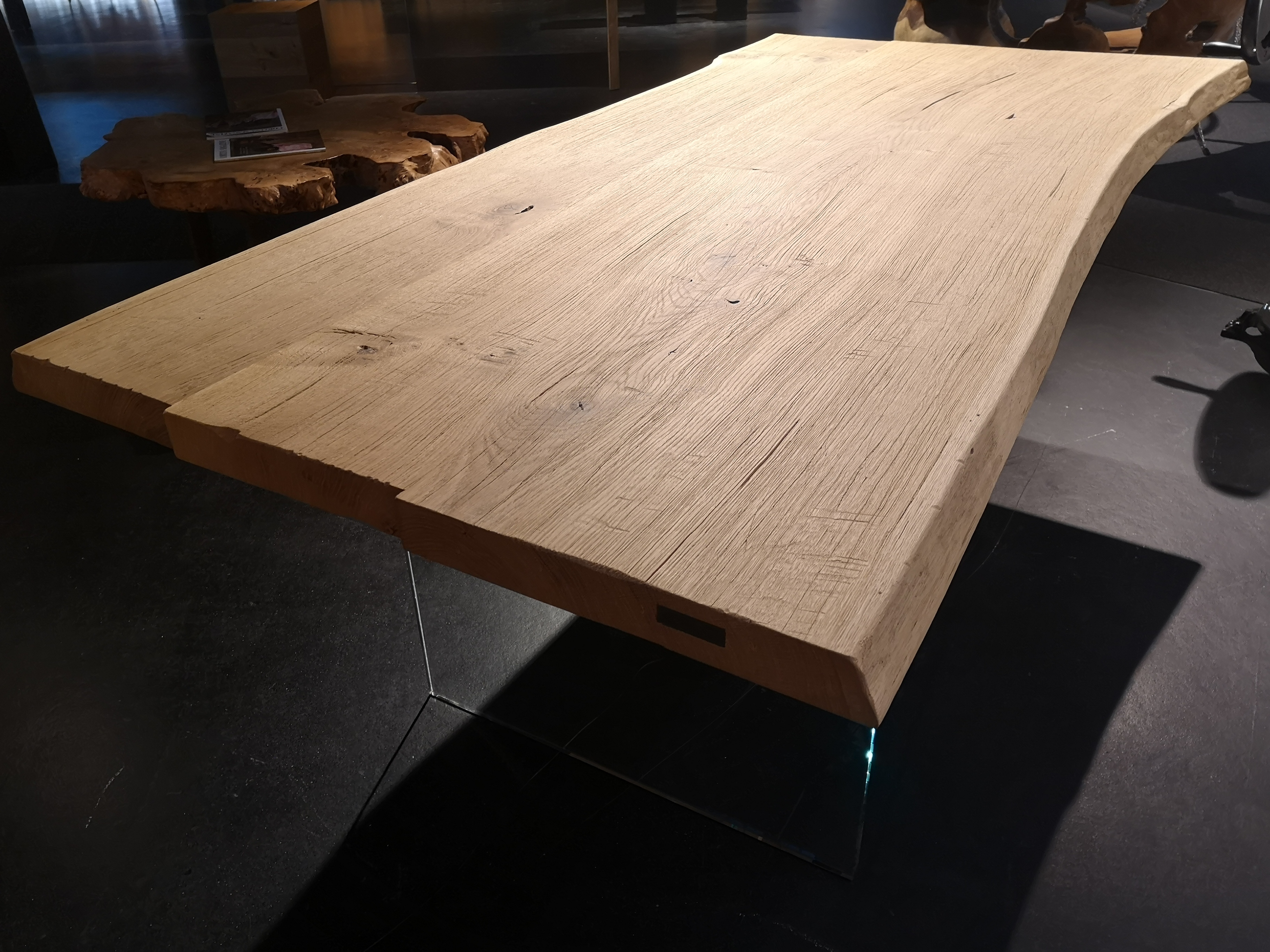 Si aggiunge poi una lavorazione spazzolata effetto grezzo denominata “Erosioni del mare”. Si tratta di un tavolo dalla grande forza materica ma al contempo moderno, caratterizzato da un grande impatto estetico.
